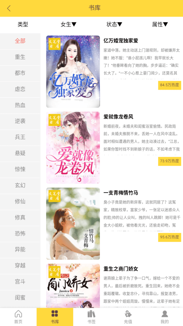 2.种类非常齐全,包括玄幻奇幻、古装言情、仙侠武侠、都市言情、穿越架空、灵异悬疑、