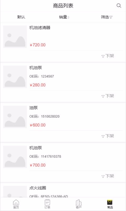 7、商品管理包含有内置丰富的汽配产品库、OE码智能匹配车型