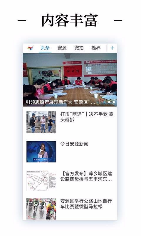 安源融媒app是一款为当地打造的新闻资讯软件,在这里用户每天都能够看到本地的最新新闻资讯,让你时刻关注国家以及生活中的大小事务,并且app上还有超多的便捷服务等你体验,有需要的朋友赶快来下载使用吧。最新鲜的资讯新闻,最及时的党建工作汇报,最方便快捷的阅读文章感受;夜里阅读文章资讯新闻打开护眼模式,显示器亮度降低维护视力;一键清理全部已缓存数据,及时清理数据维持手机上充足空间。