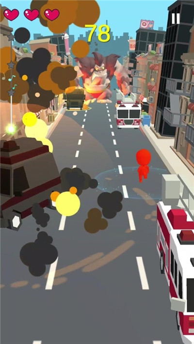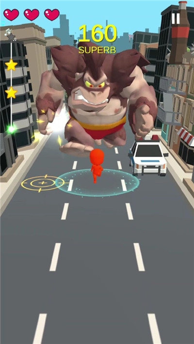 节奏逃生游戏是一款玩起来十分让人紧张刺激的逃生闯关游戏,你不仅要躲避背后大猩猩的穷追不舍,还要左右闪避路上随时奔驰的汽车,当然你也可以借助这些行驶的汽车假装左右移动,让大猩猩的注意力全放在行驶的汽车上,这时你就可以加快速度赶紧逃跑了,逃跑的距离越长,你获取的奖励也就越多。