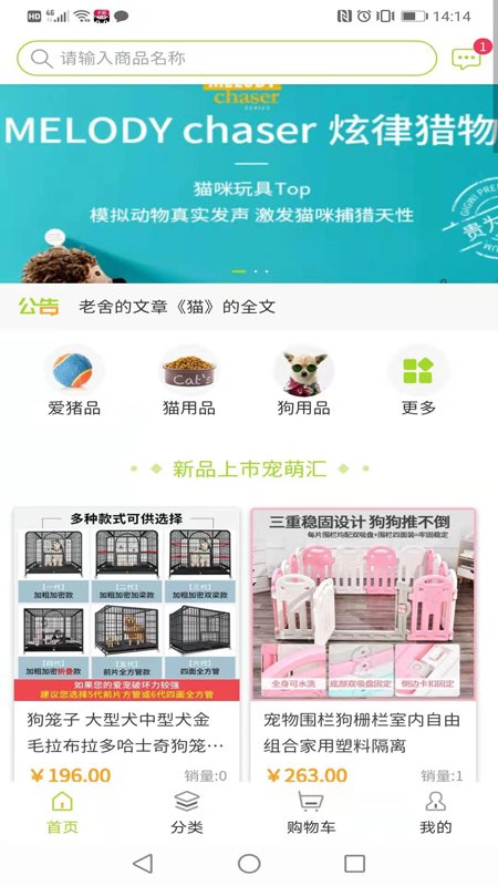 在首页这里就可以看到有各种猫狗专用商品,用户们也可以在分类这里来根据需求选择;