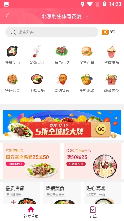 1、我们定位自己的位置也可以看到附近的优质商家,随时都能选择外卖;