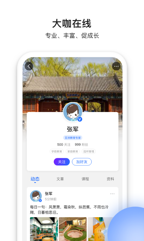 1、在应用中就能查看大咖的介绍和动态信息,并能在线关注和加好友;