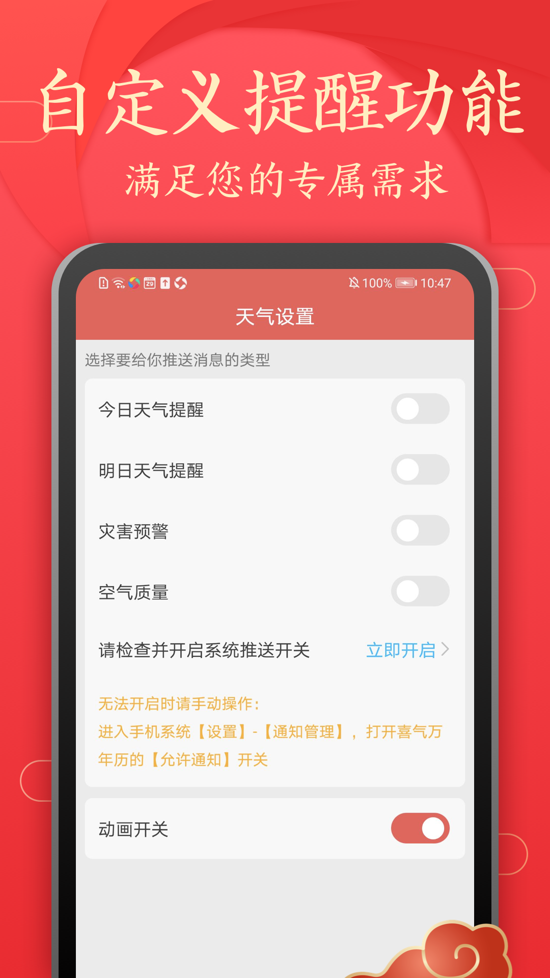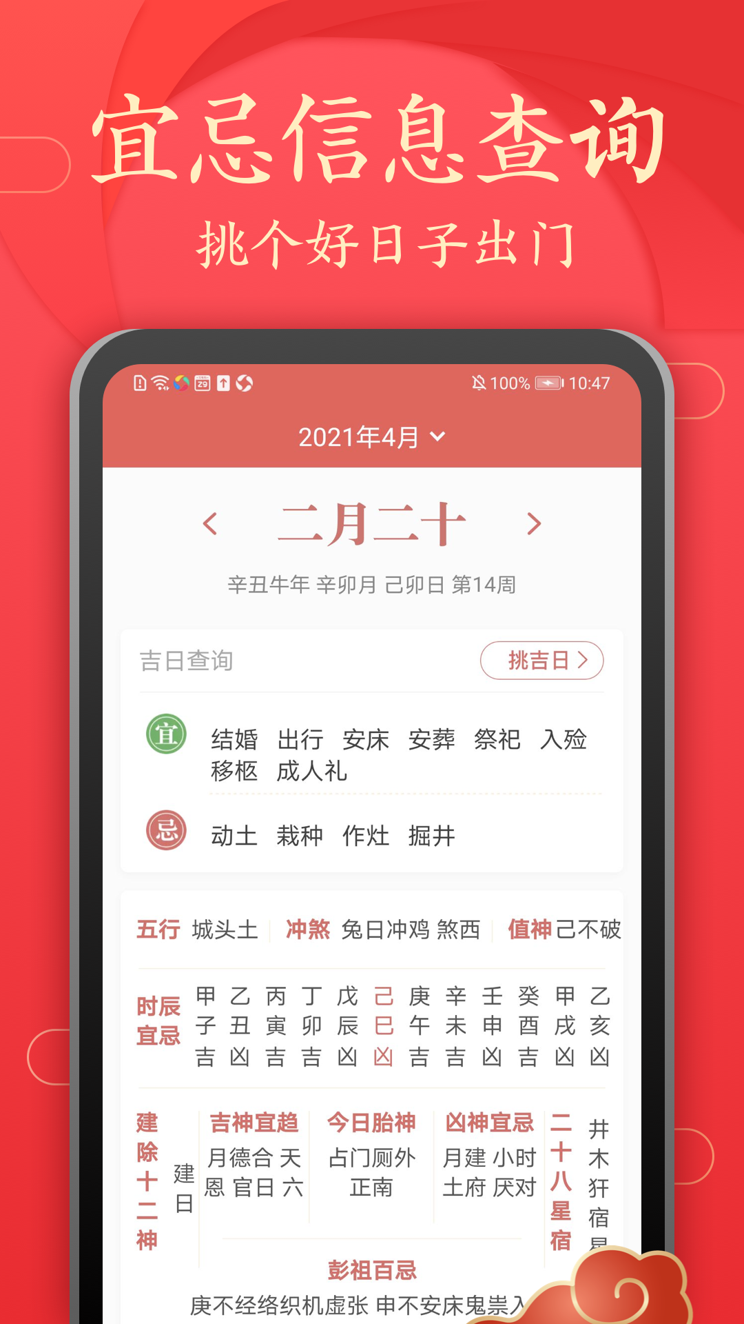 2、了解每个月份的节气、宜忌、时辰吉凶、纳音建除等,详细清晰的日历内容;