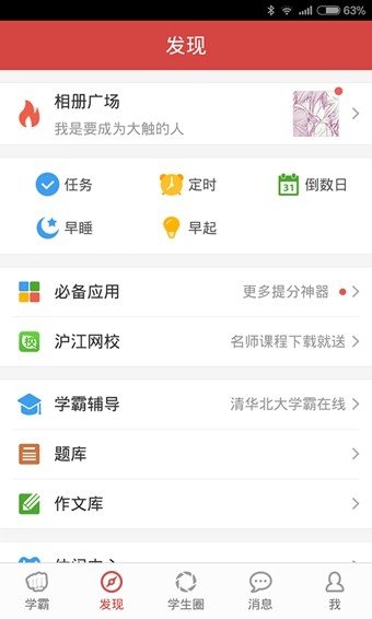 我要当学霸APP是一款让你自觉提高学习能力的教育学习软件,这里有超过3000 多位来自北大、清华等名牌大学的大学生学霸,他们通过在线授课、免费讲座、秘籍传授、答疑解惑等方式帮助中学生高效学习。和学霸做朋友,在交流中提高自己的水平,和这些善于学习的人在一起,你一定能创造出学习的奇迹,学生可利用闲暇时间来学习这些教育资源。此软件具有强制学习功能,没有自制力的学生尤其适合这款软件。快来麦氪派下载体验吧!