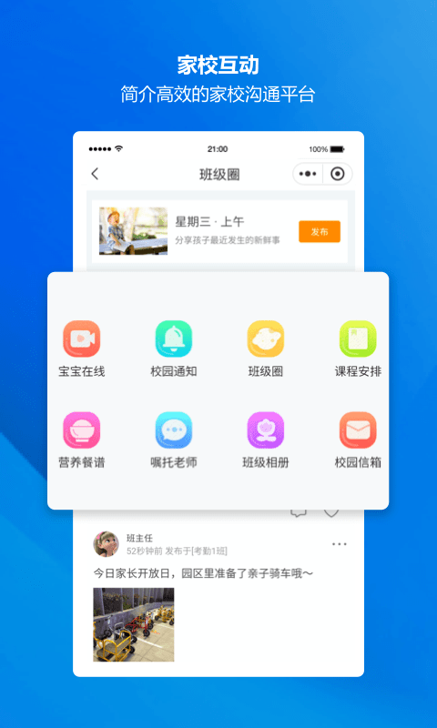 1、拥有丰富的功能服务场景,包含家校互动、宝宝在园视频监控、教室环境监测等等。
