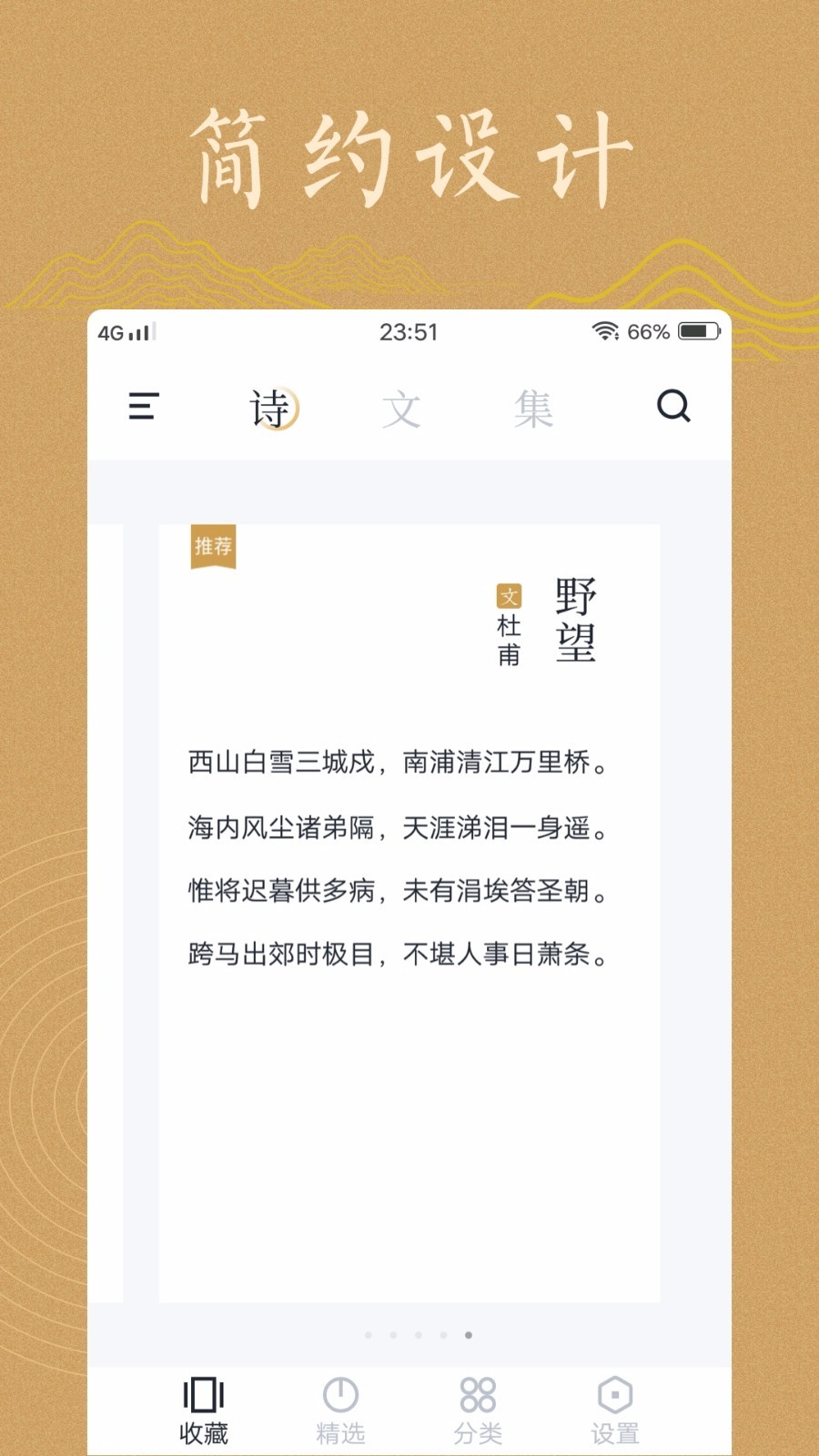 典读是一款设计独到、内容全面的经典文学诗词、古文、典籍的阅读APP。收集了中华民族自古至今的公版文学内容,涵盖了中华上下五千年的文化沉淀精华——先秦诸子百家、唐诗、宋词、元曲及各朝名著。