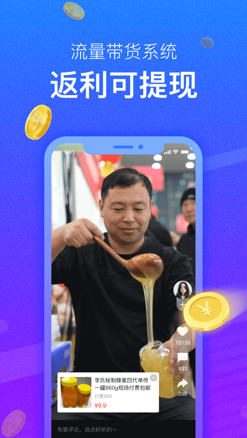 [返利可提现] 发布10 个视频以上,自带平台内流量带货系统;返利可提现,看视频买货两不误。