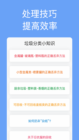 3、垃圾分类小常识,如“扔垃圾的优质时间段”、“金属罐玻璃瓶塑料瓶的正确丢弃方法”、“厨余垃圾的正确处理方法”等,提高垃圾分类及垃圾处理效率,帮助用户省时省力,深入掌握垃圾分类的核心诀窍。