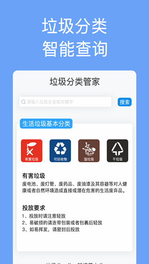 垃圾分类手册是一款非常实用的垃圾分类服务应用软件,垃圾分类人人有责,一键轻松查询,不用烦恼不知道垃圾是什么类型了;只需要一部手机就可以轻松掌握垃圾的类型,干垃圾、湿垃圾、有害垃圾、可回收垃圾等详细介绍方便;生活垃圾全面分类查询,只需要搜索垃圾关键词就可以快速查询,并且还有详细的介绍。垃圾分类手册app为用户提供了在线垃圾类别查询功能,帮助用户快速辨别垃圾。感兴趣的朋友欢迎使用下载!