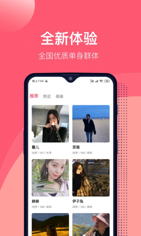 来吧APP是一款可随时随地进行轻松的娱乐交友的社交软件,软件根据全网所有用户所处位置的不同来互动聊天,不同的地理位置匹配不一样的用户人群,用户在线聊天可以隐藏自己的身份,互动了解之后选择是否线下见面还是不再继续,该应用对每个人都进行了严格的实名认证,由真人进行审核,资料真实,用户可自由的进行查看,用户能够根据自身的实际需求,快速与符合条件的人沟通交流,不需要面对面也可以进行相亲,十分方便。快来门口培训在体验吧!