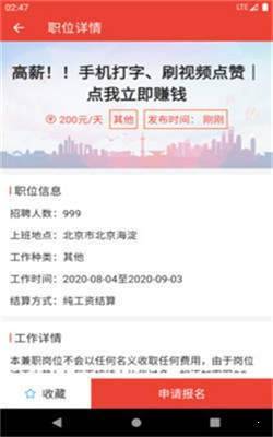 2、每天有各种各样的岗位在线上更新,可以在线报名参与进来,就能够看到详细的岗位信息介绍。