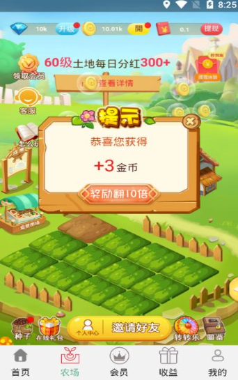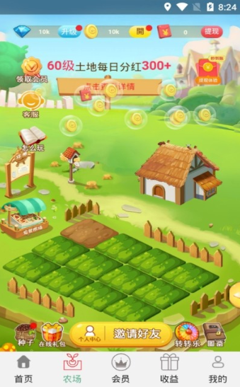 玩农场游戏可以享受60级永久分红的平台,赚省农场app可以用户钻石来升土地,每天都可以拿分红,奖励多,玩法丰富,还结合了电商平台,功能多,不会让你无聊的一个赚钱游戏。