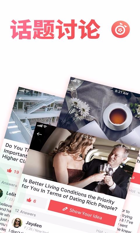 可以参与话题讨论,通过兴趣爱好相识,认识你的另一半,发现和你一样的人;