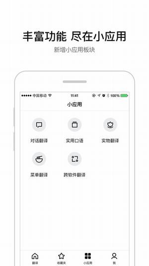 对话翻译、实用口语、实物翻译、菜单翻译、通知栏查词、跨软件翻译,六大实用功能集合在“小应用”列表,用户可根据需求直观选择功能,减少操作流程,体验更智能的翻译功能。