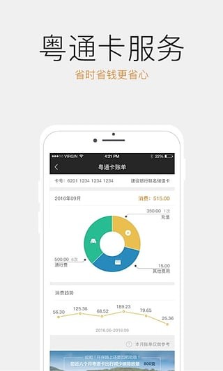 1、粤通卡服务-在线充值粤通卡,查询实时消费账单,首创高速消费提醒;一键绑定粤通卡,减去输入麻烦