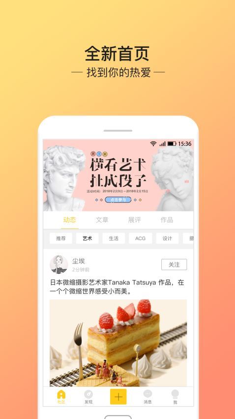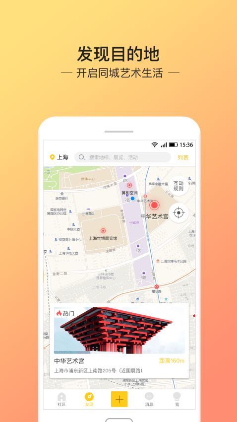 在这里,你除了可以参与到身边正在发生的艺术展览活动,还可以分享自己的艺术体验,参与社区的讨论互动。我们怕你没有观点和态度,一千个人眼中应该有一千个哈姆雷特。全新首页,找到你的兴趣所在,全新的视觉界面,通过热门、分类帮你发现更多元化的艺术内容和兴趣相投的小伙伴。发现,探索你的真实艺术世界,最直观的发现你身边的艺术场馆与展览活动,签到打分点评,成为别人眼中的艺术达人。