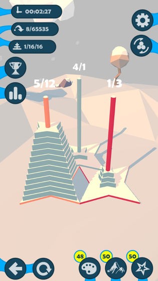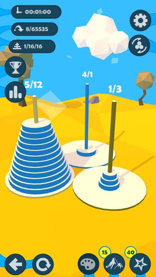 游戏给我的感觉就像是在设法去解开递归的问题,在游戏中,玩家需要将秤砣从大到小移动到另一个木棍上,剩余的一根木棍用于调动,发挥出自己的空间思考能力与调配能力,让游戏变得轻松有趣。游戏需要的逻辑性很强,你要不断的思考怎样才能让小盘子放回去,然后又不能被大盘子压着。一开始你要面对的盘子可能只有五个,但是随着关卡难度的加深,你最终将要面对数十个盘子,这种时候才是真正考验玩家们智慧的时候,而且你还要注意,重复的来回放盘子会被视为无效移动哦。