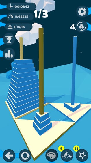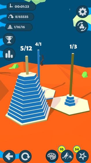 《Tower of Hanoi汉诺塔手游》是一款休闲类的游戏,精心设计经典玩法,不断移动柱上的砖块,完成需要,简单的操作玩家易上手,感兴趣的小伙伴可别错过了,还在犹豫什么,赶快下载体验吧!游戏中玩家们将要来到一个个不同的场景之中,在这些场景里,你要将一座盘塔里的盘子分别放在别的柱子上,让他们也变成一座规则的塔。游戏的玩法非常魔性,你必须在规定的时间里将盘子来回的放在别的柱子上,叠成一个新的塔,不过你一定要遵守大盘子不能放在小盘子上面的规则才行。在规定的时间里你的有效放置换边次数越多,你的奖励也就越多。游戏中还有世界排行榜,你可以和来自世界各地的高手一绝高下。