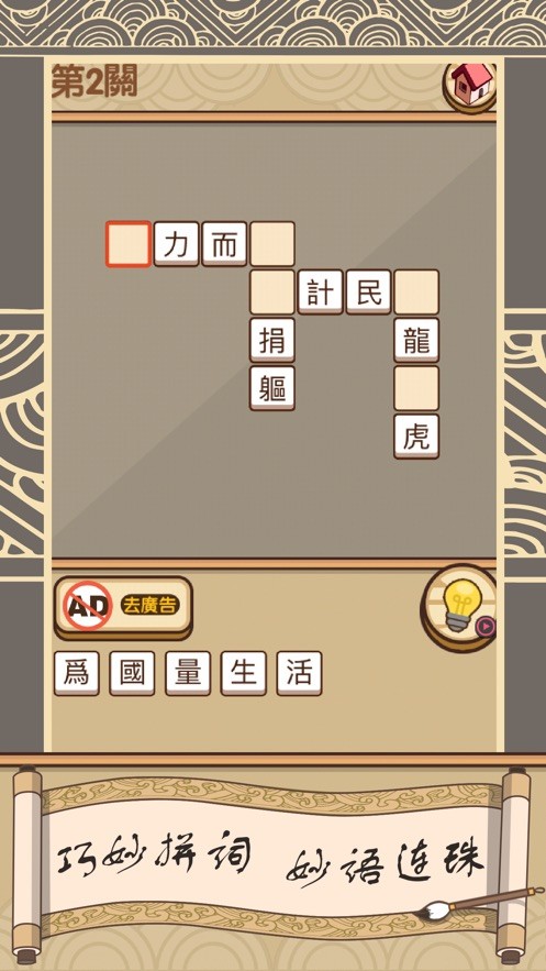 新加入进去的游戏玩家从非常简单的现在开始,把握一下这个游戏如何实际操作;解题时候出现一个成语,随后在其中会少一个字,在下面的汉字中找标准答案;往后面的难度系数会越来越大,出现的成语更多,也也有同音字,搞混视野。