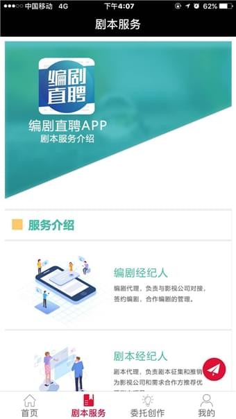 编剧直聘app,面向于影视行业内的求职者和招聘者打造的求职招聘平台。在编剧直聘app中求职者可快捷的展示个人信息轻松找功工作,而招聘者则能快速招贤。编剧直聘APP的主要业务有针对影视行业内的求职者和招聘者提供一个免费途径,招聘求职双方可以进行自由的在线和电话沟通。同时编剧直聘APP提供展示圈内优质影视项目的业务功能,有大量急需合作的委托创作和影视项目,影视行业内的人士可以在编剧直聘上面找到自己想要的信息。