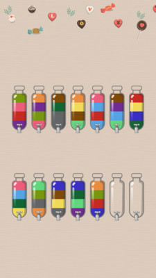 1.每一瓶试管都有着许多不同颜色的液体,玩家需要按照顺序将它们分流出来。