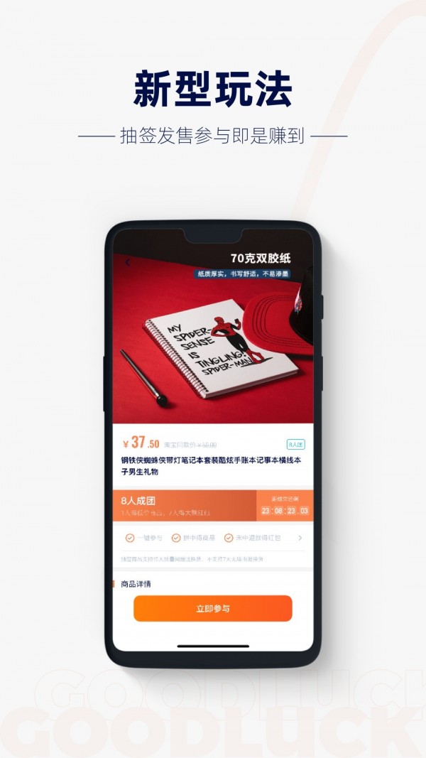 帮助用户买到价廉物美的商品。会挑选优质的折扣补贴商品,发起限时抽签。中签者可以买到折扣补贴商品,未中签者可以获得平台的补贴红包。无论买到还是买不到,只要参与抽签,你都会赚到。不仅是一个折扣购物平台,更是一种有趣的生活体验。