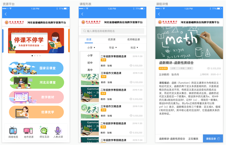 河北省基础教育在线教学资源服务平台是一款官方最新上线的教育学习类软件,惠及河北全省1200万学生展开教育学习,在这样一个特殊时期,很有必要开展这样的网络端直播教育模式。通过互联网+的传输模式,做到真正意义上的停课不停学,让学生在家中开展高效的线上学习。