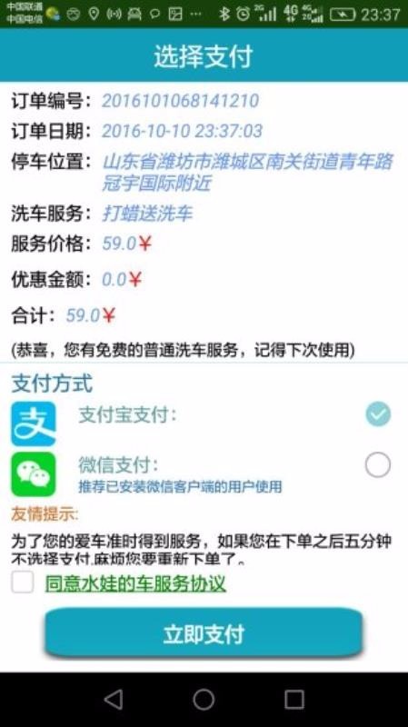 5.洗车订单费用可以直接在线支付,这里支持微信和支付宝的移动支付方式;