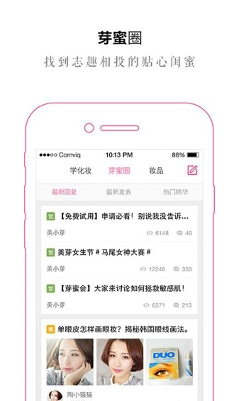 接着,就是【芽蜜圈】栏目,在这里,有很多朋友都会晒出她们的美妆心得、化妆品等,让你找到志趣相投的伙伴