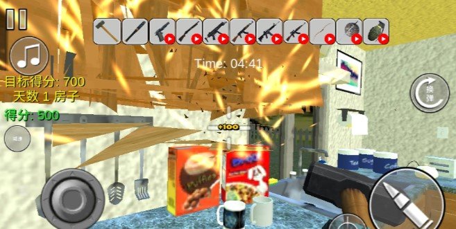 1、拿起武器在游戏中挑战,破坏家里所有的东西,将眼前的东西全部都摧毁
