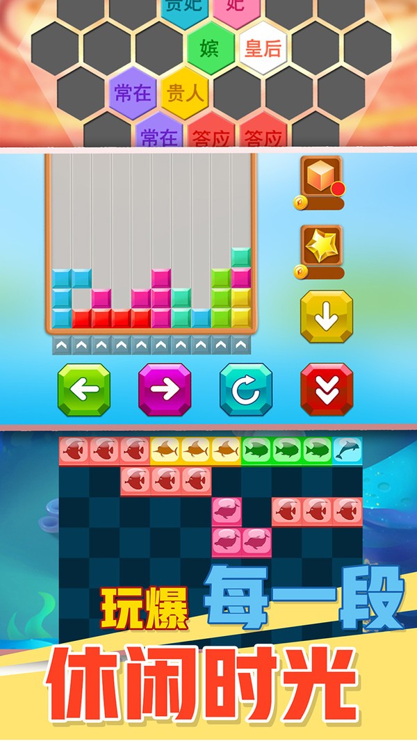 3.拼拼乐:四角拼拼、六角拼拼、1010、后宫传奇、皇上吉祥,丰富的六边形消除.