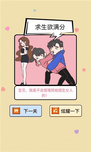 情侣求生欲测试服是一款恋爱主题的搞笑休闲游戏,游戏考验的就是男朋友的求生欲,这里有超多专属于年轻人的趣味问题等你来解答,稍微一不注意女朋友就会发货生气,所以你要小心谨慎哦。游戏设置了数百个不同的关卡,作为一名直男,你和女朋友的恋爱过程就要经受各种的考验,随机的事件不断的发生,接下就看你怎样应对了,弄不要就是一记耳光来袭。快来麦氪派站下载体验吧。