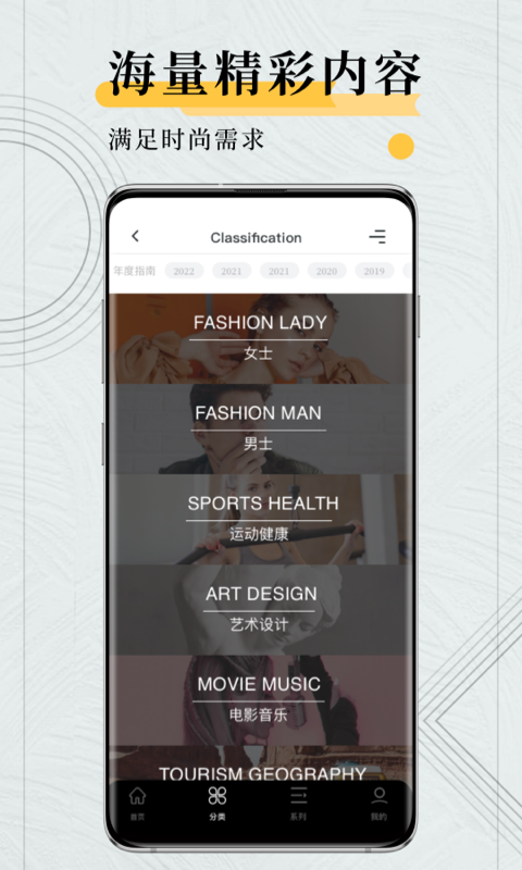 3、海量时尚相关的精彩内容,各种分类,男士、女士、艺术设计等,满足不同用户的时尚需求。