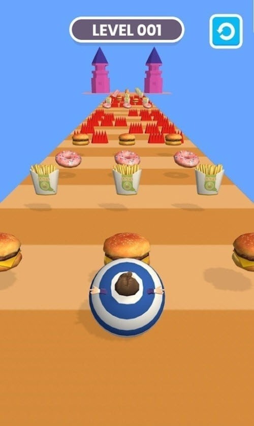 1、赛道上会出现大量的汉堡,帮助胖子哥拒绝它们,一定要在赛道中躲避这些汉堡