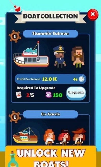 3、通过升级渔船,解锁更多新的抓鱼道具,在大海上不同的探索。