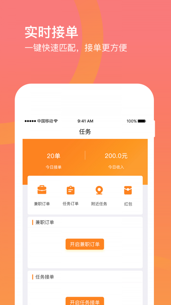 用户有时间,打开接单一键接收兼职、任务。