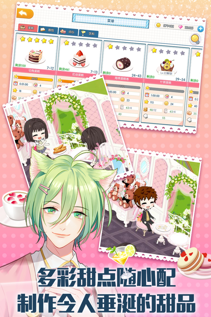 2、收集众多的美男猫咪,然后一起恋爱,一起经营自己的甜品店
