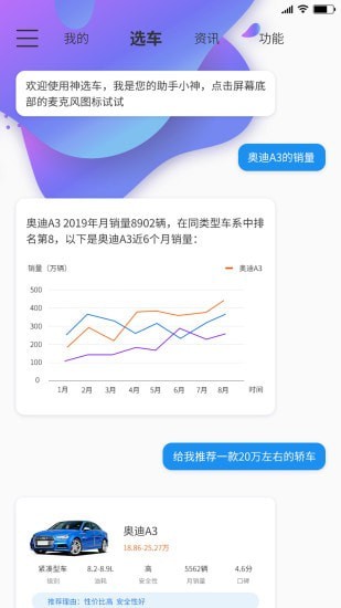 1、语音搜索,你可以直接使用语音功能,就可以搜索到自己想要的汽车信息。