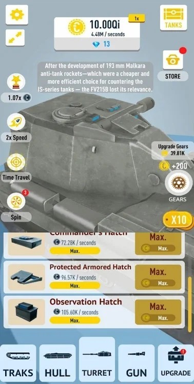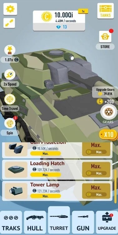 空闲坦克3D游戏是一款休闲放置游戏,玩家通过你的努力去获得很多很多的金币,这样你才能解锁坦克的零部件,完成坦克的组装,你还可以去升级这些零部件,让你的坦克性能能好,拥有更多的丰富坦克零件来提高坦克整体属性,加入到各大战斗中尽情享受坦克战斗的刺激体验,可以让玩家观看的更加的清楚明白,让玩家可以不断的畅玩其中的关卡,快来下载体验吧。