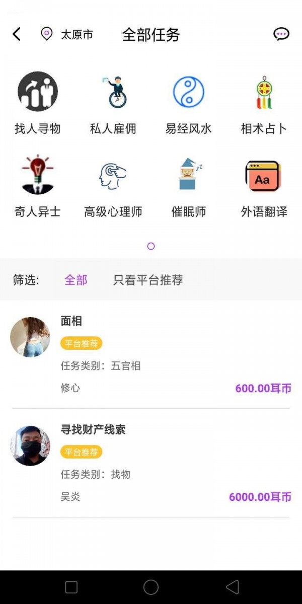 心耳在线游戏是一款技能交易app,用户可以在此寻找风水师、占卜师、奇人异士以及高级心理师和外语翻译、睡眠师等具备技能的人,当自己具备以上技能需要的时候不仅可以自主找人,可以让对方自动找自己,让对方找自己的话用户可以通过发布任务的方式传递讯号,只要在任务中说明自己的需求即可,平台汇集多个特殊领域的专业人士,着重解决寻人找物、易经风水,相术占卜、私人雇佣,催眠师等特殊领域棘手的问题!猎人获取报酬,无痕迹,无录音,无后患,心耳就是您的特殊任务经纪人!老板验收任务后,猎人方可拿到酬金,老板发布有偿任务,猎人酬金有保证,快来下载吧。