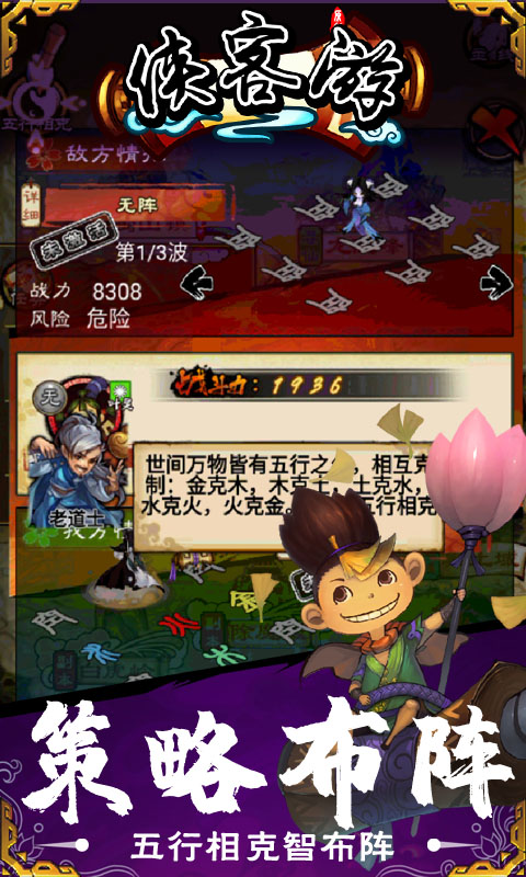 侠客游送648充值版游戏这款游戏将会带领咱们来到一座全新的国风世界中,中途你可以见到不同类型的修仙人士,同时还可挑选一名自己喜欢的角色来进行各式各样刺激的历险战斗,感兴趣的小伙伴们可以来这个江湖世界仔细瞧瞧!游戏突破了传统挂机的玩法。本游戏的运镖/劫镖模块,拥有独创的人工智能算法的随机地图生成系统,和“愤怒的小鸟”类似的益智烧脑小游戏,能让玩家爱不释手。本游戏的核心战斗是基于九宫格的玩法,结合五行相克的原理,加上创新的阵法系统,在PVP中,阵型间相互克制的,没有最强的组合,拥有极高的策略性。