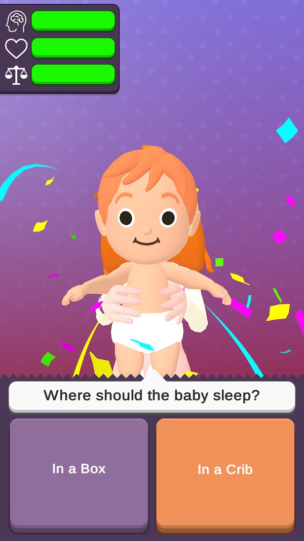 父母的抉择,这是一款模拟养成的游戏,玩家在这里将会扮演一个父母的角色,然后来学习如何更好的养孩子,宝宝还很小,所以你需要帮助孩子做出很多的选择,不管是生活中的小事情,还是每个阶段的重要抉择,如果你能为宝宝做出最好的决定,那么你就可以成为有史以来最好的父母!还有各种游戏模式等你来体验,你会对他生活的任何方面帮助他做决定。从换尿布,喝奶粉,换衣服开始,然后还能够为他准备车玩具。