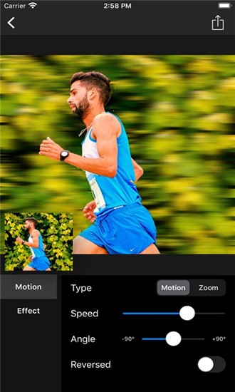 2.运动模糊使您可以在特定对象上应用运动效果,只需选择区域并指定运动模糊的方向,即可获得完美的运动模糊图片