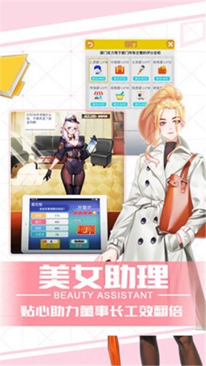 这是一款十分精彩的商业模拟合作经营手游,是根据知名的影视剧创作而改编的作品,让我们置身于真实的都市商业情景之中,体验一场全新的商战模拟竞技人生,还能发挥我们的商业头脑优势,来打造顶尖的巅峰奇迹,铸就一个崭新的商业帝国传奇。游戏中有二次元风格的人物立绘,作为老板的你,可以寻找红颜,招募女秘书,亲密互动增加好感度等。休闲的放置玩法让玩家不用肝也能拥有很好的游戏体验。