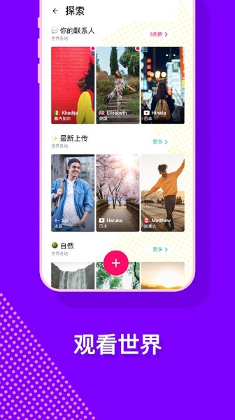 不论我们是想找到可以分享特别时刻的人还是拥有开阔眼界并且可以一同探索世界多元文化和人类差异的旅途同行者。可以满足你愿望的探险就在你的指尖!游历分布在世界各地的城市。在每个国家都认识一些朋友。聊一聊彼此的文化。简单打个招呼问候一下或者在视频聊天时展现你的友好一面,看着他们开心起来。我们的语音文本翻译器能够保证彼此沟通无阻。
