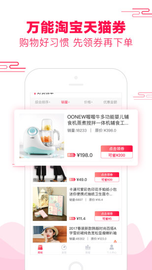 悦惠APP是一款集合了主流商城优惠券的购物平台,是万能的淘宝天猫的搜券工具,让用户获得购物的好习惯,在购物之前优先搜索优惠券再进行下单,领取优惠券即可看到商品的券后价格,为用户带来了优惠最低价格,随时购物随时享受优惠;领券网购超级省钱,在悦惠app享受专属优惠券,及时查看详情,发现海量福利和优惠,快来下载体验吧。
