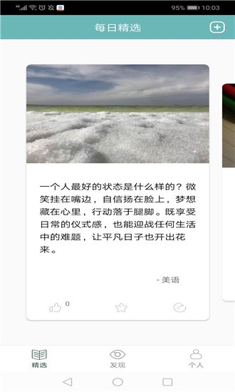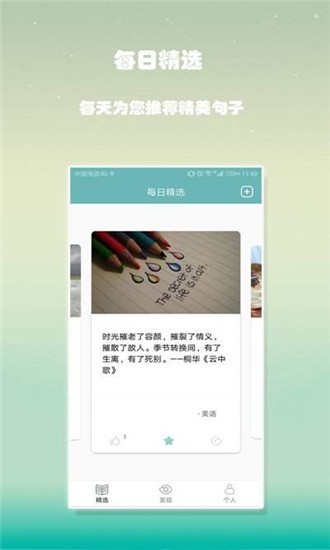 每日美语是一款记录、分享生活的应用软件,每天为用户分享一句唯美正能量的句子,用户可以收藏、分享,让这些美好的句子陪伴大家前行,一起记录生活点滴,每日美语app是一款可以每天为用户分享各自美句语录的手机软件,这款软件里面拥有非常丰富的语录内容,还有各种唯美的ͼƬ,用户在这里可以看到各种美图美句,每天看到的都不一样,需要的朋友欢迎下载体验吧。