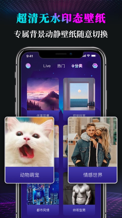 这里的壁纸种类也是非常的多样化,包含了娱乐明星、热门游戏、动物萌宠、电影电视、动漫新番、自然风光等多种类型,你想要的壁纸在这里都可以找到,大家可以根据自己的需求进行选择,操作也是非常的简单,看到喜欢的一键就可以下载使用。