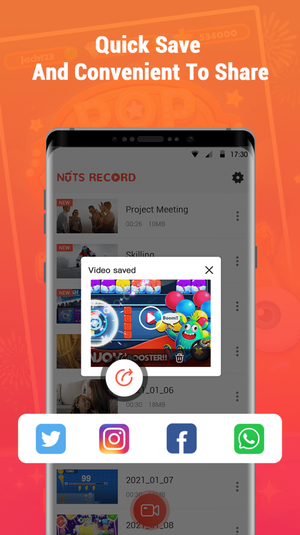 Nuts录屏属于一款录屏神器,当你下载此软件后你就能轻松录制相应的视频内容,直接悬浮窗口去使用,不会影响你对于其他应用,此软件还提供了丰富的视频剪辑功能,让你可以对录制的视频进行全方位的剪辑。它也是理想的游戏记录器和视频记录器。平稳运行并以高质量进行录制,选择我们的屏幕录像机吧!